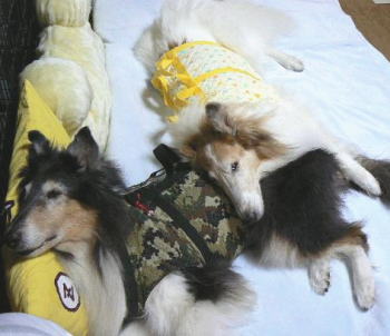 老犬になると体温調節ができなくなるので、コリーといえども寒さに弱くなるということで、お外に出る時には、その上からポンチョを羽織って貰って出ます。